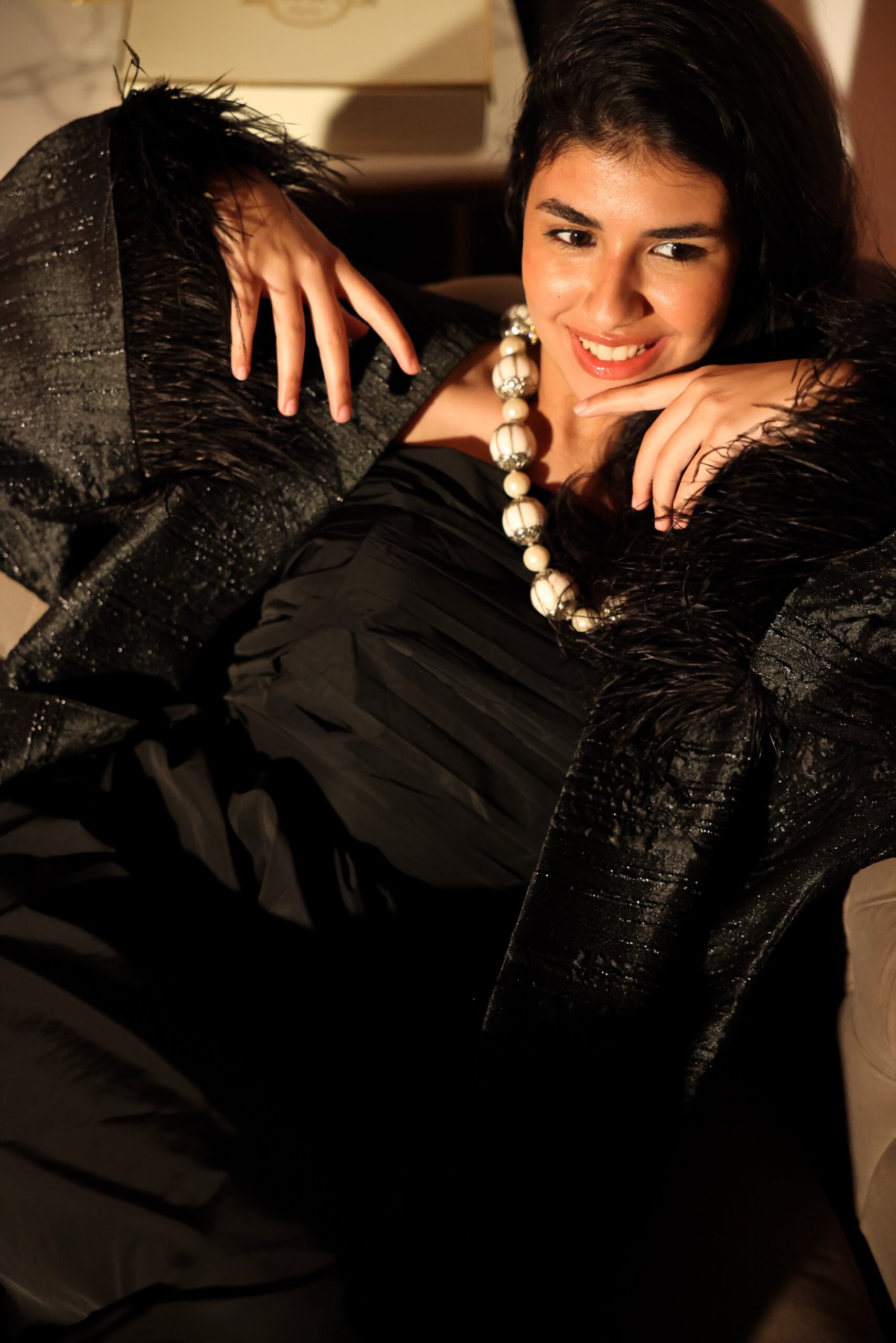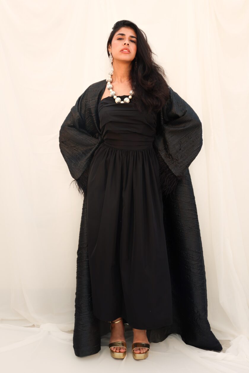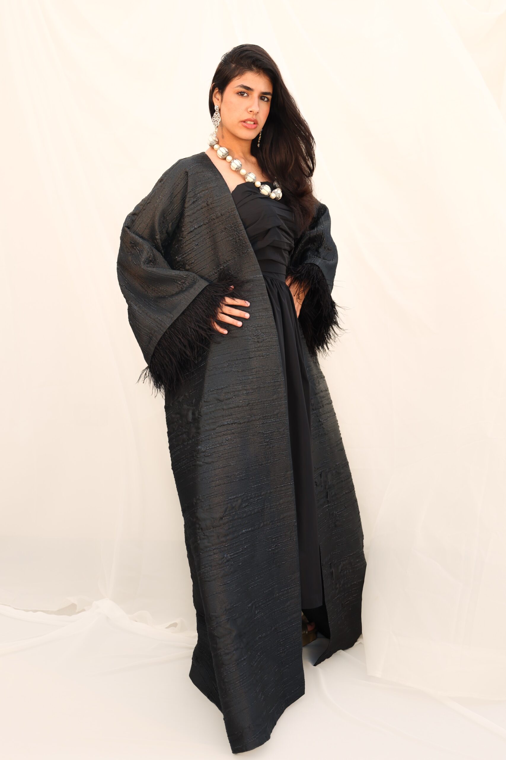 Luxury silk abaya kaftan with feather design on the sleeves. Fully lined